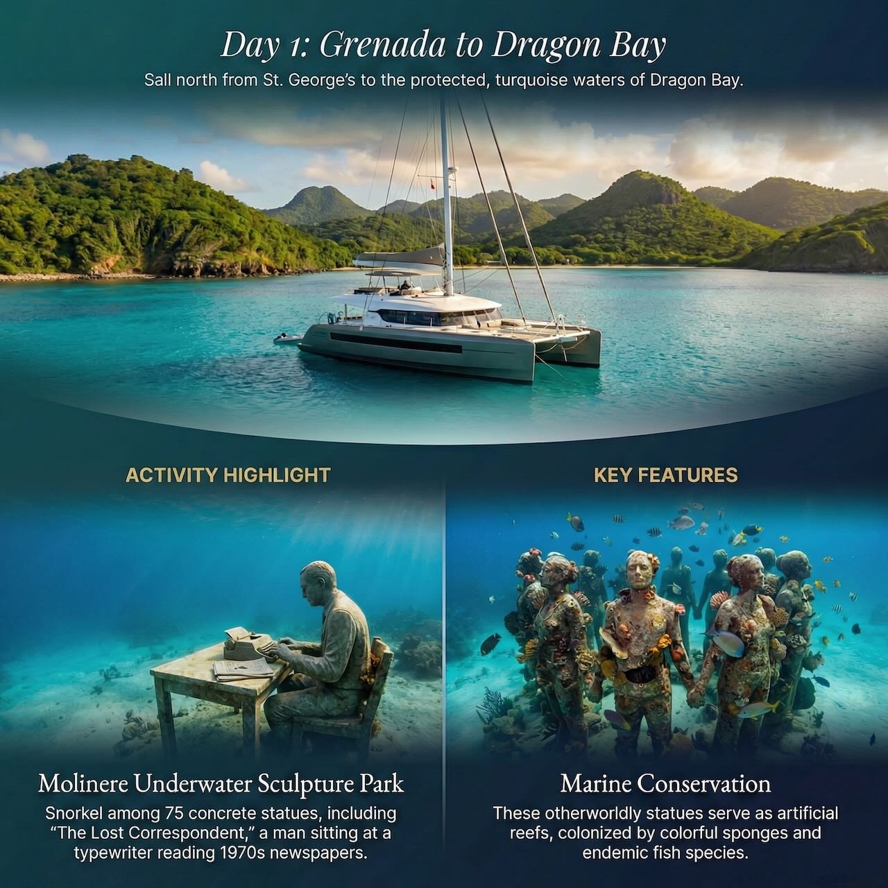 Sail north from St. George's to the protected, turquoise waters of Dragon Bay.