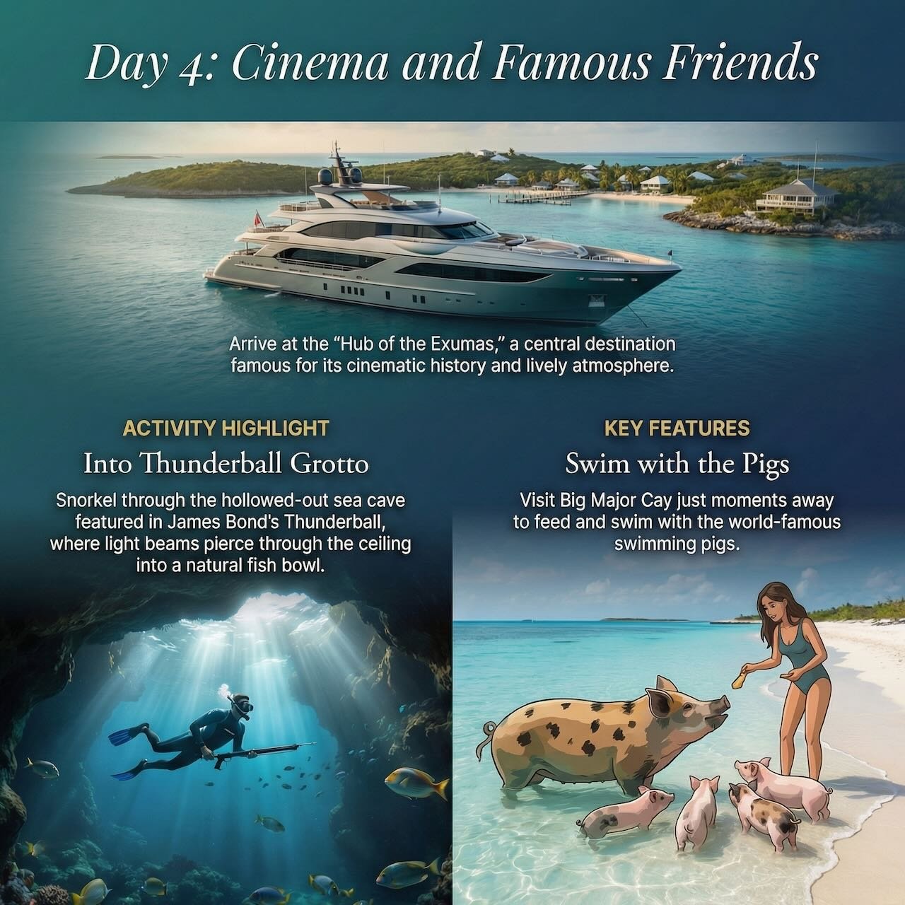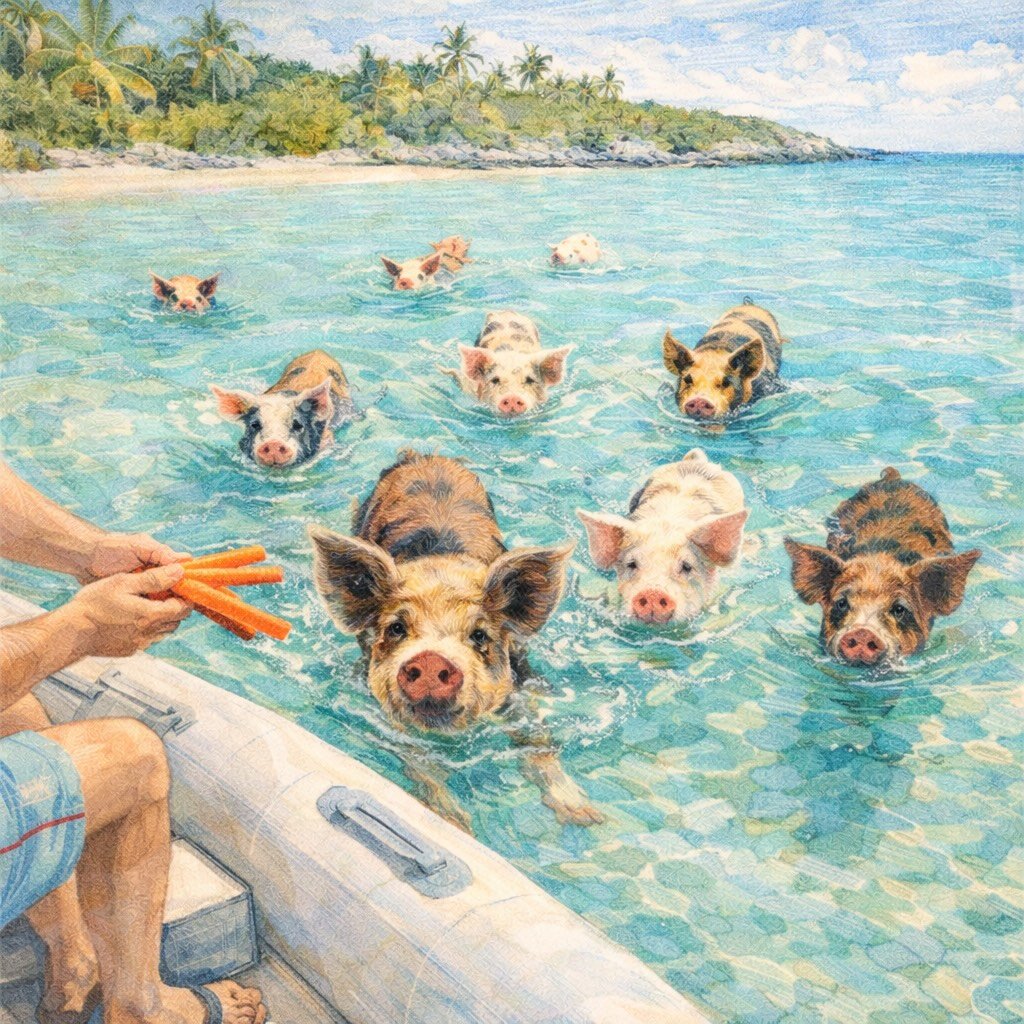 A surreal, slightly comical spectacle of feral pigs paddling out to greet the tender. While Instagram has made them famous, seeing a 300-pound sow doggy-paddle through crystal-clear water remains a bizarre, bucket-list experience. Bring carrots, watch your fingers, and prepare for chaos.
