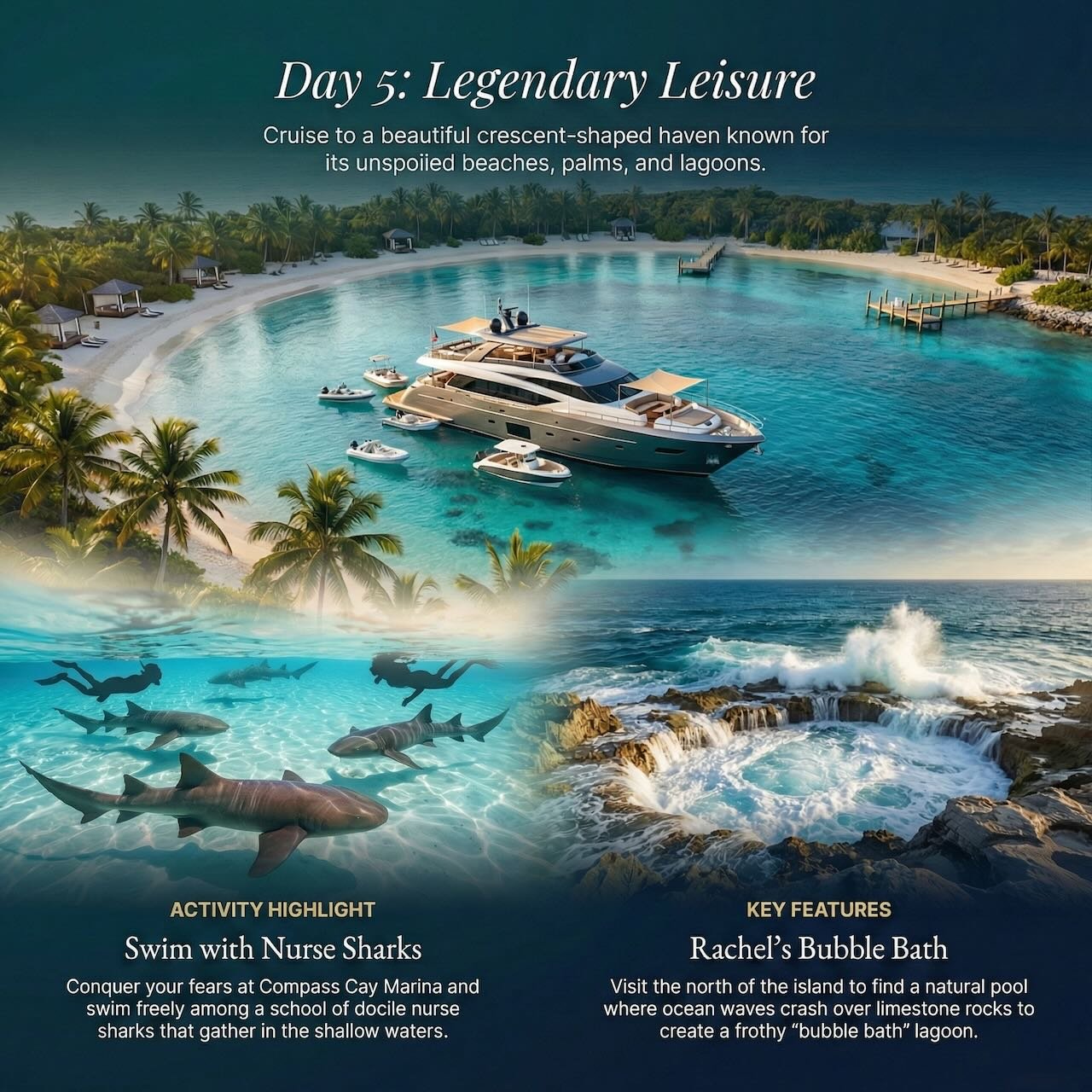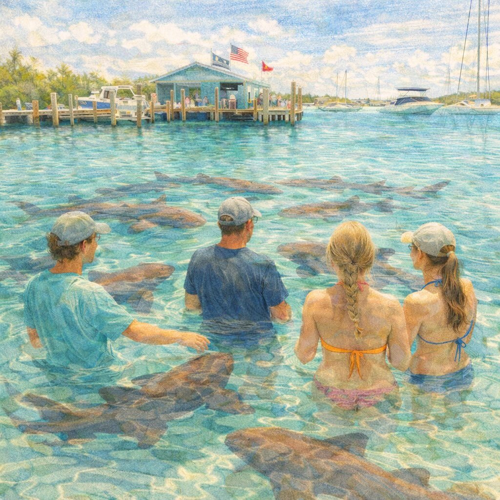 Famous for its resident nurse sharks. These docile bottom-feeders congregate on the submerged swim platform at high tide. Guests can stand waist-deep in the water as dozens of sharks glide around them—a thrill that feels dangerous but is actually quite serene.