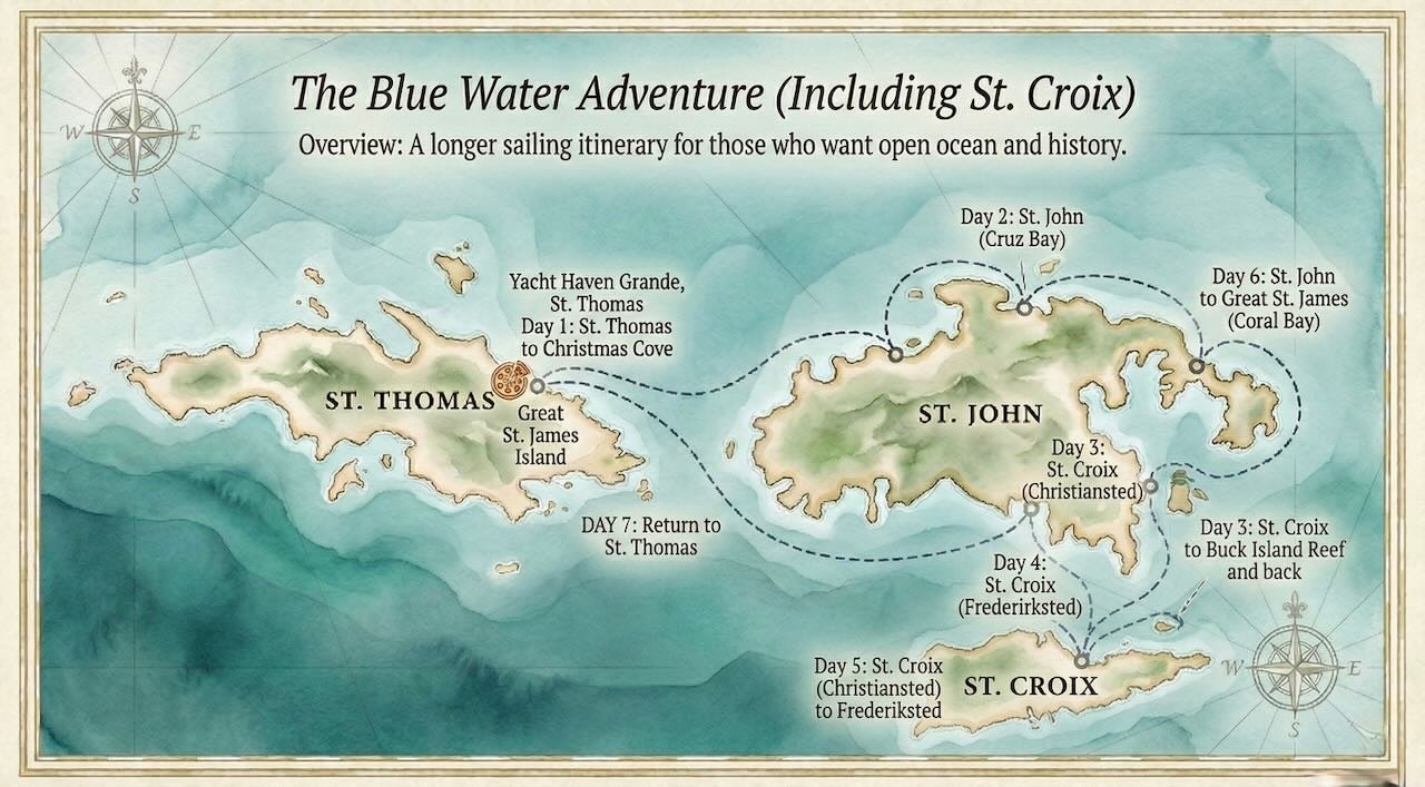 A: St. Croix sits about 40 miles south of St. Thomas and St. John, separated by a deep ocean trench. Because of the longer open-water sail (approx. 4-6 hours), it is often excluded from standard 7-day leisurely charters unless specifically requested by guests who enjoy blue-water sailing.
