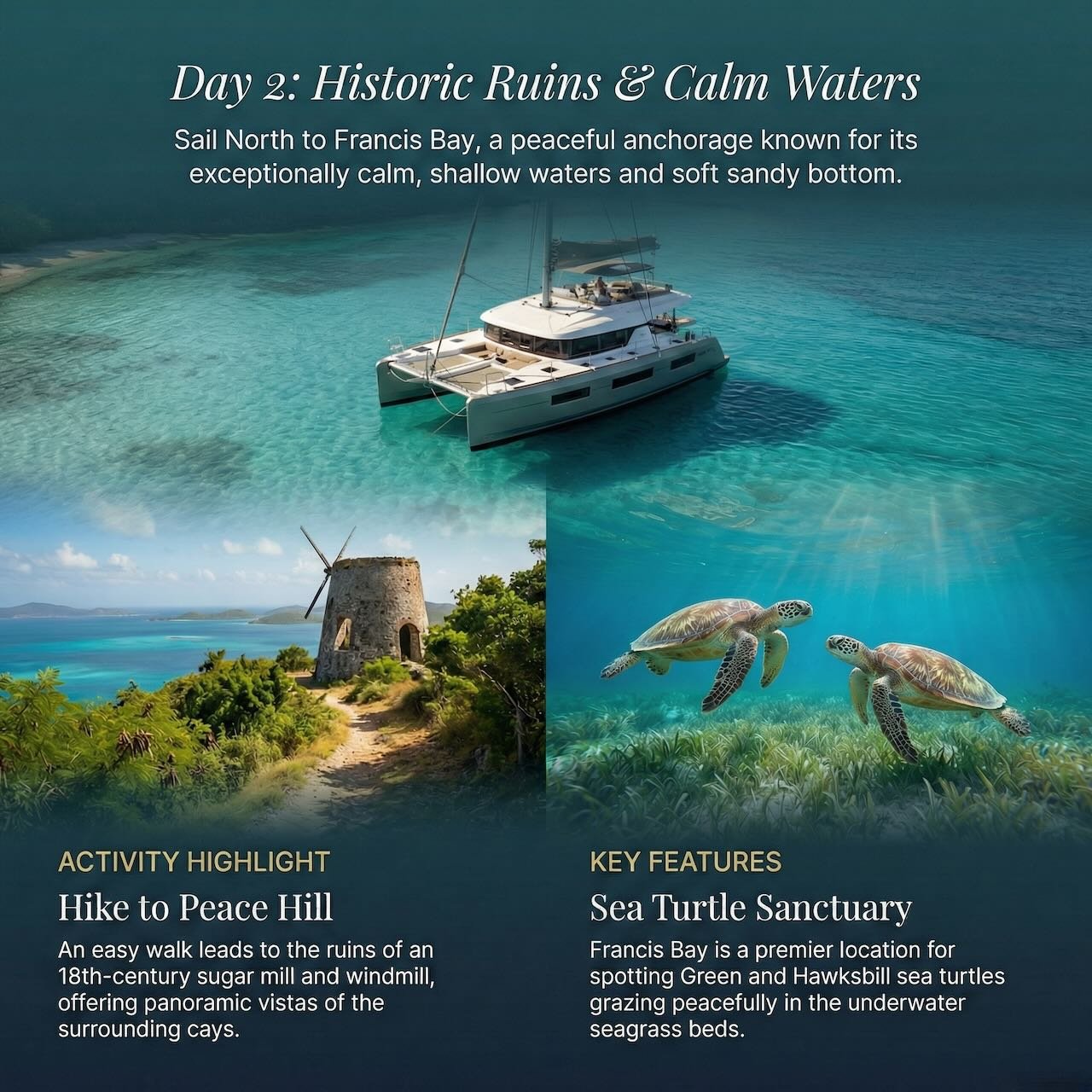 Sail North to Francis Bay, a peaceful anchorage known for its exceptionally calm, shallow waters and soft sandy bottom.
