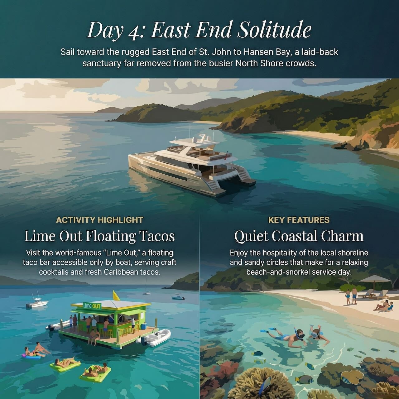 A floating taco bar that has become an instant icon. Accessible only by boat, this lime-green structure serves gourmet tacos and craft cocktails to guests floating on lily pad rafts. It is the ultimate “lunch on the water” experience—playful, delicious, and entirely unique to the territory.