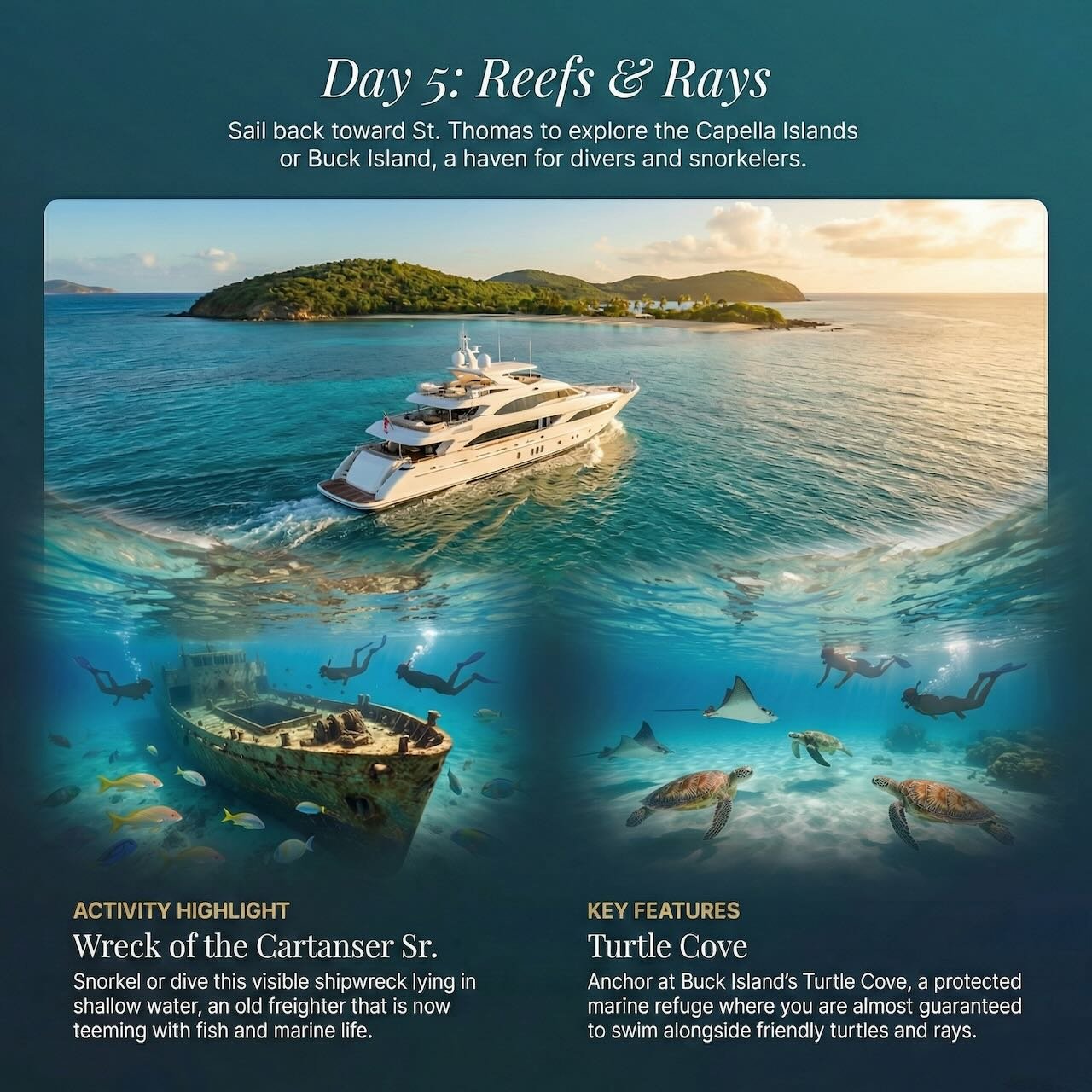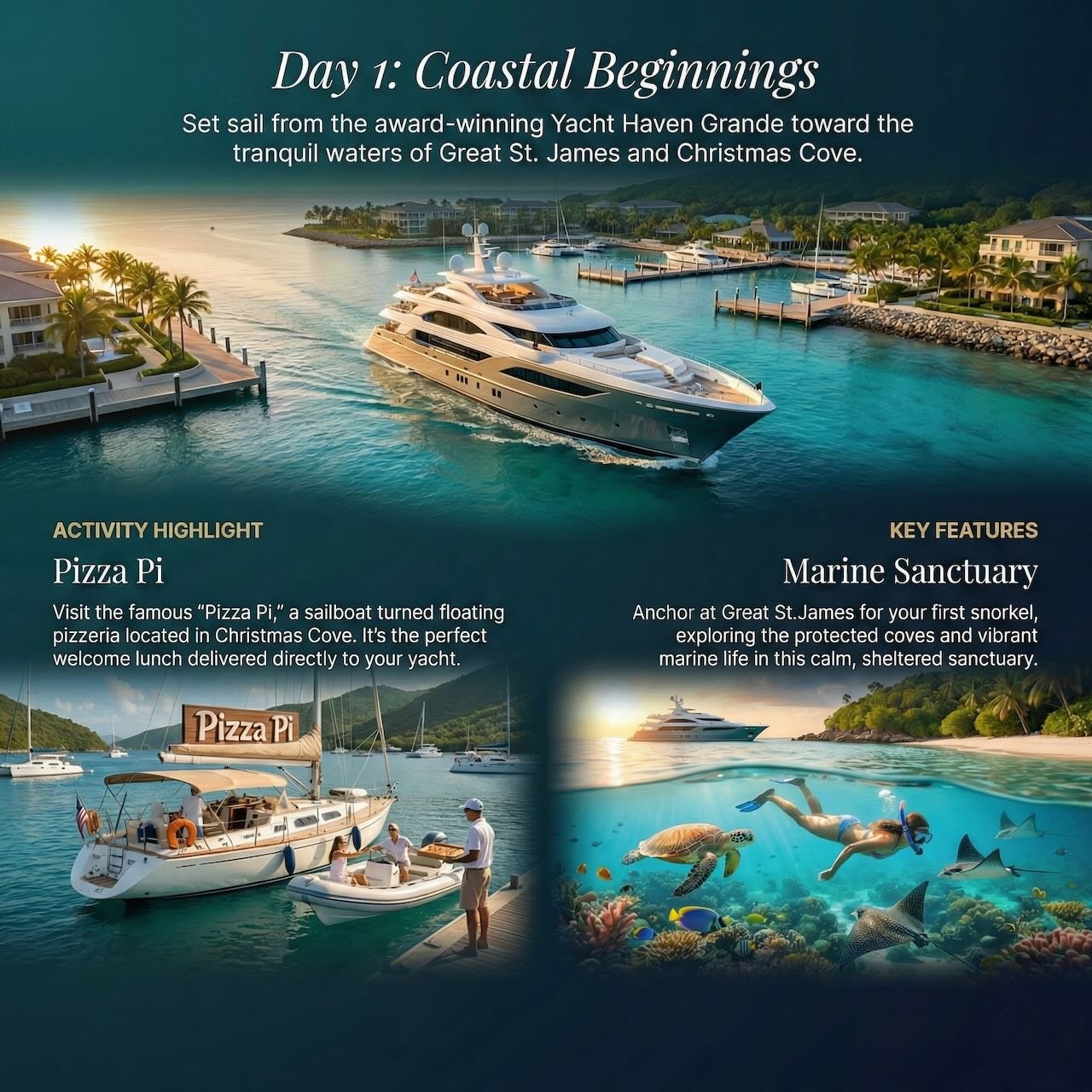 Set sail from the award-winning Yacht Haven Grande toward the tranquil waters of Great St. James and Christmas Cove.